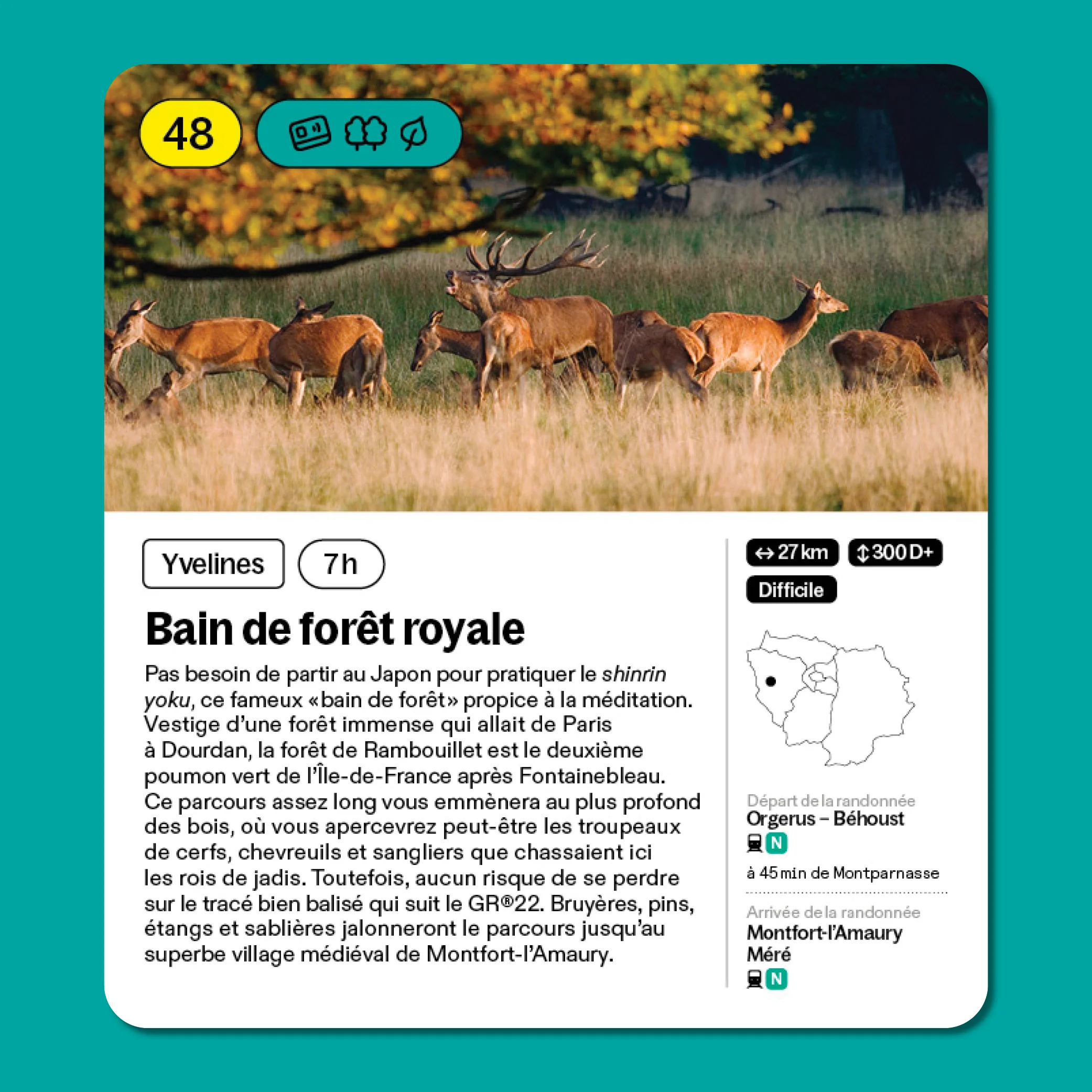 Au recto : une carte papier des 100 plus belles randos d'Ile-de-France