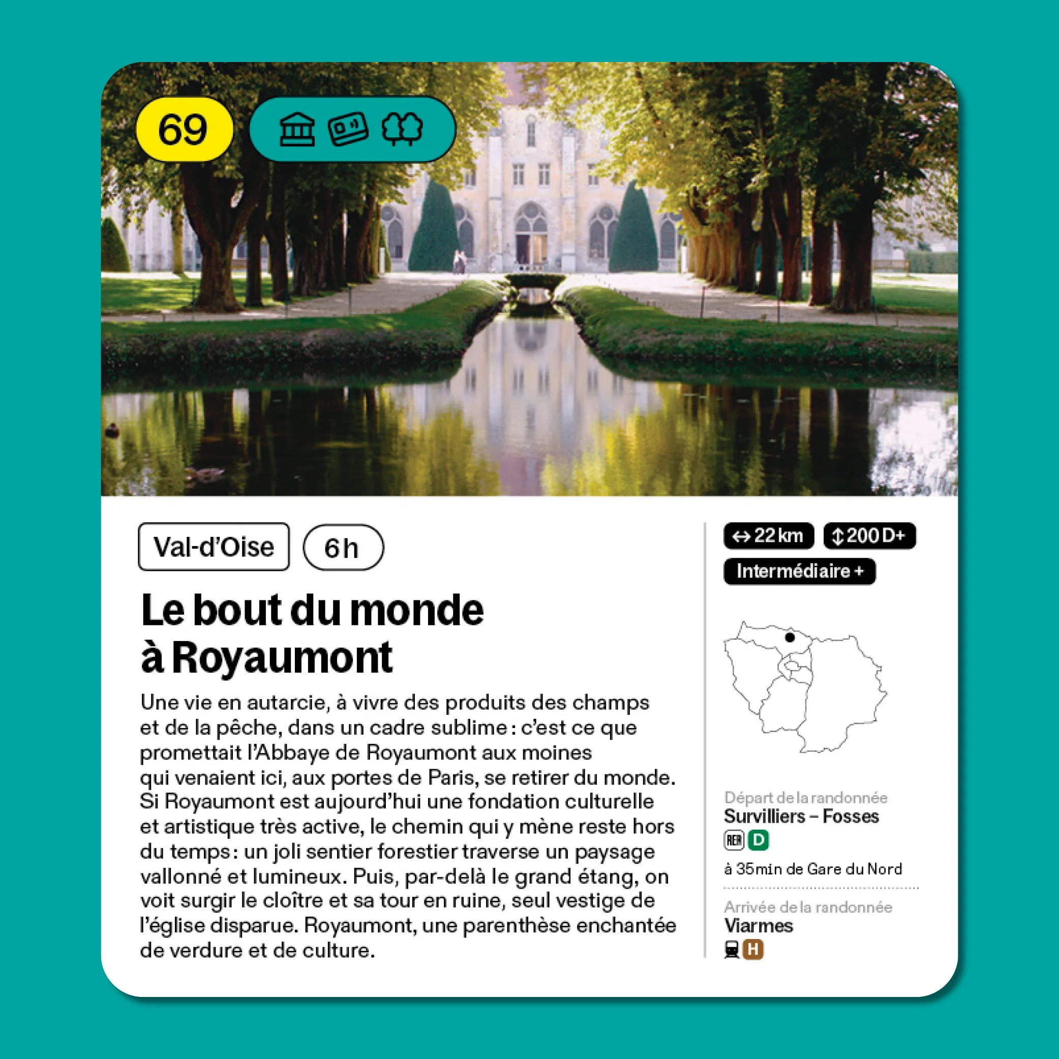 Si Royaumont est aujourd’hui une fondation culturelle et artistique très active, le chemin qui y mène reste hors du temps : un joli sentier forestier traverse un paysage vallonné et lumineux. Puis, par-delà le grand étang, on voit surgir le cloître et sa tour en ruine, seul vestige de l’église disparue. Royaumont, une parenthèse enchantée de verdure et de culture.