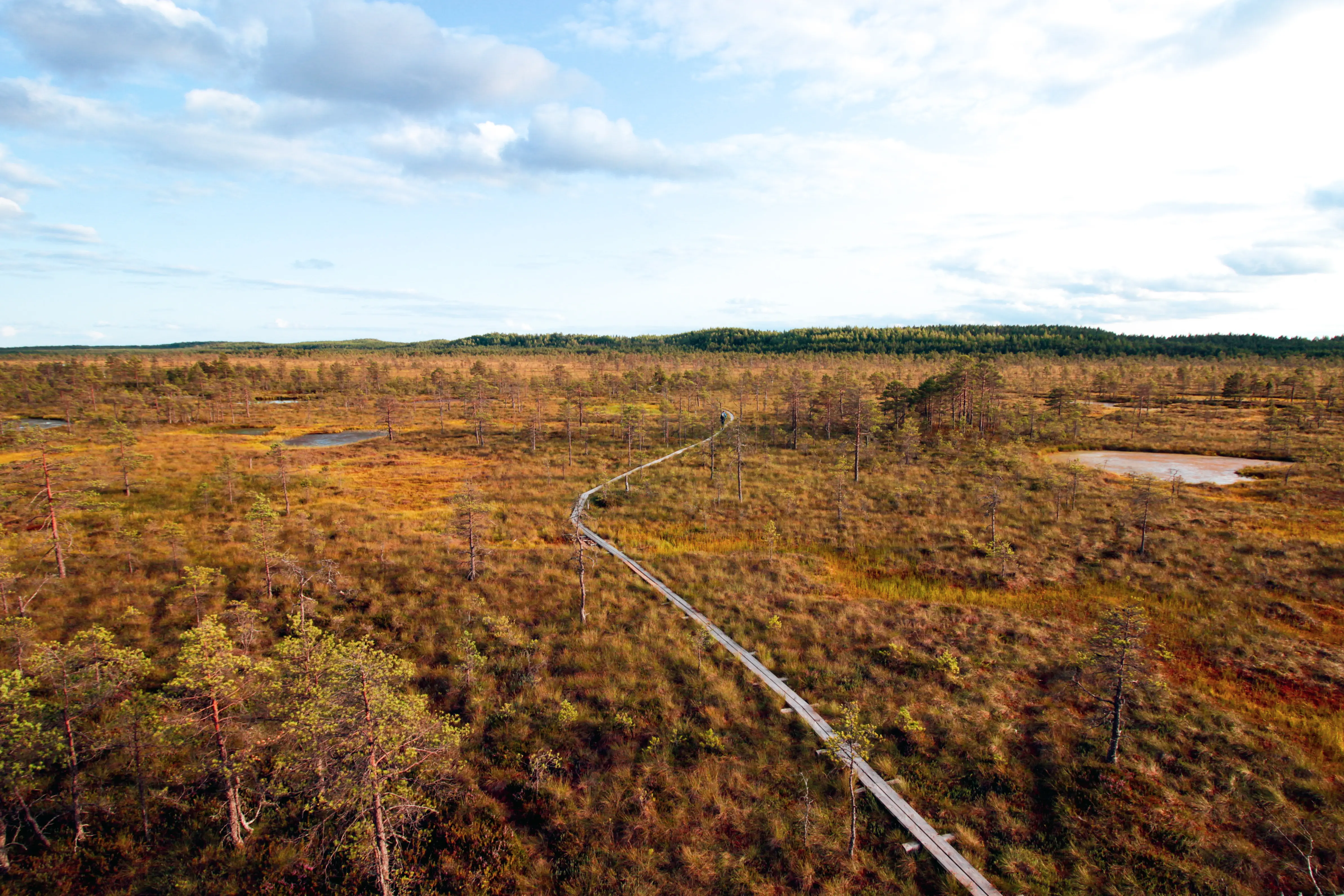 Vous arpentez votre premier chemin de planche pour traverser la tourbière de Viru. Une tour d’observation permet d'admirer le paysage caractéristique de la région : des dizaines de lacs et d’îlots recouverts de pins. Après cette parenthèse enchantée, marchez une (longue) section de 4 km sur le bas côté de la route nationale sans chemin aménagé. Suivez une piste à travers la forêt pour rejoindre le campement de Järvi en bord de lac. Lancez-vous dans une nouvelle traversée de tourbière, encore plus étendue que la première (Põhja-Kõrvemaa). Le sentier progresse de lac en lac jusqu’au campement de Jussi.