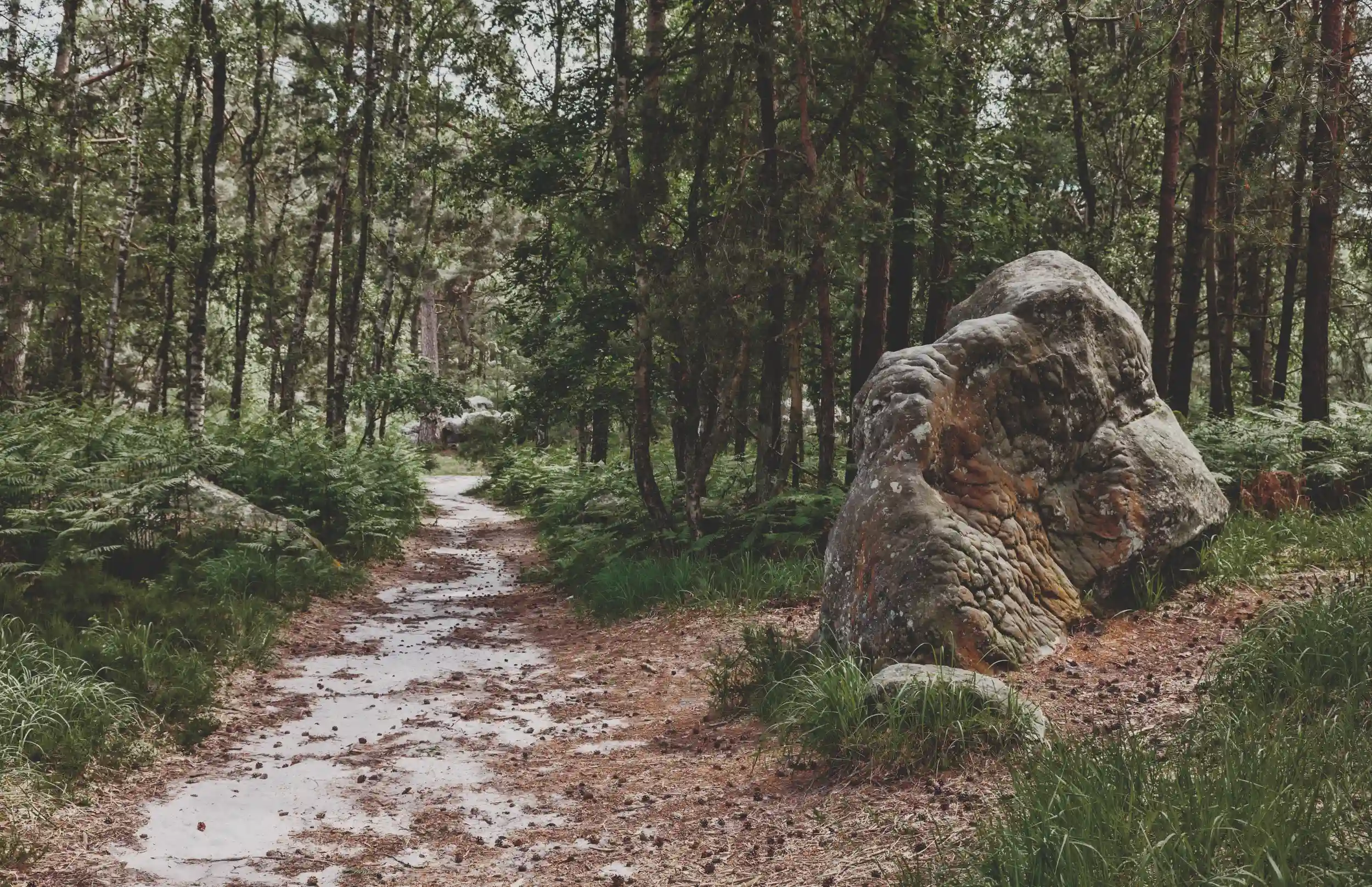 Rejoignez rapidement, via l’Avenue Léopold Pelletier, le joli parc de la Roche Fontaine où se situe la mairie. À peine sortis du parc, on s’enfonce immédiatement dans la forêt sur un petit chemin où déjà s’égrainent les rochers, comme un avant-goût de la randonnée. Commencez par une petite grimpette au milieu des rochers du massif des Rochers-Gréau sur un petit chemin qui serpente de part et d’autre du plateau.