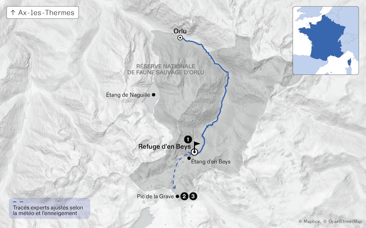 Nous filerons au refuge d’en Beys, en plein coeur de la Réserve nationale de faune sauvage d’Orlu. Nous établierons notre camp de base au refuge - non gardé en hiver - et choisirons, au jour le jour, les itinéraires qui nous appellent, en fonction des conditions et de notre inspiration. Le plus difficile étant de choisir quel fromage nous allons amener...